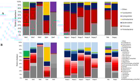 Microbiome compositions of duodenum tissue and bile fluid samples of five recurrent CBD stone patients. (A) Phylum level. (B) Genus level.