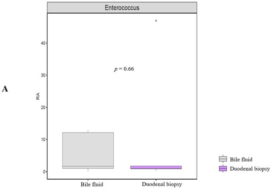 Taxonomic compositions were analyzed using the ANOVA range test and Turkey’s HSD test at the genus level. No significant (p = 0.66, Welch’s t-test) enterococcus compositional difference was observed between bile fluid and duodenal mucosa at the genus level. (Figure 7A).