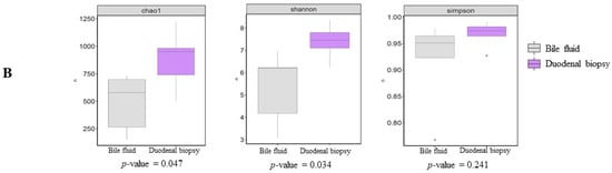 Additionally, alpha-diversities of bile fluid and duodenal mucosa were determined using Chao1, Shannon and Simpson diversity indices. (Figure 7B) The microbiome compositions of the bile fluid and duodenal mucosal samples collected from the five SR patients were analyzed, and Chao1 and Shannon indices were significantly different, but Simpson indices were not. (Chao1: p = 0.047; Shannon: p = 0.034; Simpson: p = 0.241) These results indicate that microbiome compositions and environments are similar in the bile duct and duodenum in recurrent CBD stone patients. Subsequently, we compared enterococcus compositions in bile fluid and duodenum, which differed in the SR group, in order to investigate the possibility that enterococcus in bile fluid originated from duodenum. We conducted NMDS ordination based on Bray–Curtis’s dissimilarities in genetic diversity in a microbial community to cluster 16S rRNA sequences into OTUs based on sequence similarities (Figure 8). NMDS analysis showed no significant difference between the microbial environments of bile fluid and duodenal biopsy samples in the five SR patients (p = 0.46). These results supported the notion that enterococcus in bile fluid originated from duodenum.