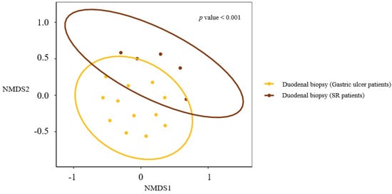 NMDS ordination of beta-diversity analyses at the ASV level demonstrated a significant difference between the duodenal compositions of the SR group and controls, indicating the environments represented differed. The beta diversity analysis of microbiome diversity based on weighted Braycurtis-distance also showed the duodenal microbial environments in SR patients and controls to be significantly different. (Figure 9) Supplementary Figure S1. illustrates NMDS ordination of beta-diversity analyses at the ASV level between the SR group (duodenum tissues and bile fluid) and controls (duodenum tissues).