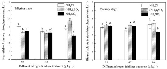 Concentration of bioavailable As in the rhizosphere soil under the different forms and levels of N fertilizer treatment conditions. Different letters in figure mean that there are significant differences among the N levels of each fertilizer (p < 0.05).