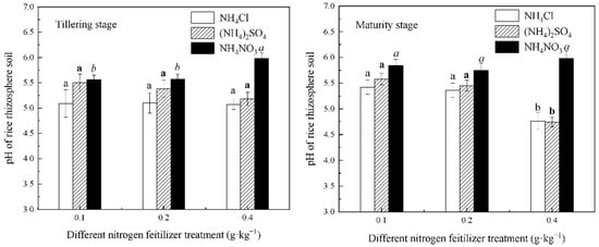 The pH of the rice rhizosphere soil under the different forms and levels of N fertilizer treatment conditions. Different letters in the figure mean that there are significant differences among the N levels of each fertilizer (p < 0.05).