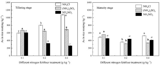 As concentration in the rice roots under the different forms and levels of N fertilizer treatment conditions. Different letters in figure mean that there are significant differences among the N levels of each fertilizer (p < 0.05).