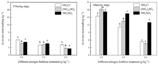 As concentration in the rice stems and leaves under the different forms and levels of N fertilizer treatment conditions. Different letters in figure mean that there are significant differences among the N levels of each fertilizer (p < 0.05).