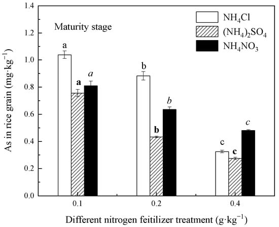 As concentration in rice grains under the different forms and levels of N fertilizer treatment conditions. Different letters in figure mean that there are significant differences among the N levels of each fertilizer (p < 0.05).