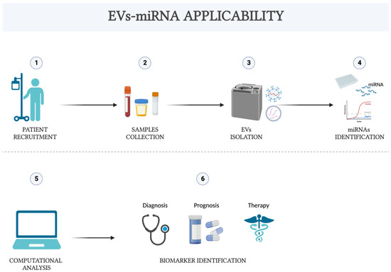 Flowchart of the potential applications of EVs-miRNA from patient selection to biomarker identification.