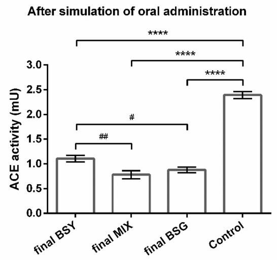 After simulated oral administration, the final BSG protein hydrolysate maintained its ACE-inhibitory capacity since the effect on enzyme’s activity against the control (Figure 2) remained with the same statistical difference compared to the initial hydrolysates (Figure 1). On the other hand, the final BSY protein hydrolysate greatly improved its ACE-inhibitory capability since the effect on the enzyme’s activity against the control (Figure 2) was more pronounced compared with the initial hydrolysates (Figure 1). Interestingly, the final MIX protein hydrolysate also improved its effect, equaling the final BSG peptides (Figure 2), thus displaying an unexpected potential. The results of BSY and MIX protein hydrolysates indicated that these bioactive peptides are positively influenced by oral administration.