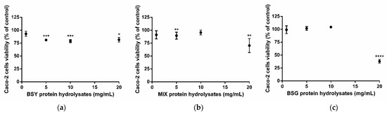 Caco-2 cell viability after incubation with brewing protein hydrolysates. Cells were exposed to (a) brewer’s spent yeast—BSY; (b) 50:50 mixture of BSY:BSG—MIX; (c) brewer’s spent grain—BSG, for 24 h. Results are presented as % of control (cells without treatment) and mean ± standard deviation (SD) values of three independent experiments. Significant differences of cells viability from control: * p < 0.05, ** p < 0.01, *** p < 0.001 and **** p < 0.0001 (One-way ANOVA followed by post hoc Dunnett’s multiple comparisons t-test).