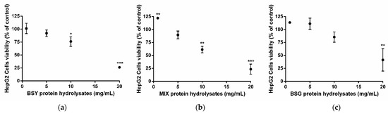 HepG2 cell viability after incubation with brewing protein hydrolysates. Cells were exposed to (a) brewer’s spent yeast—BSY; (b) 50:50 mixture of BSY:BSG—MIX; (c) brewer’s spent grain—BSG, for 24 h. Results are presented as % of control (cells without treatment) and mean ± standard deviation (SD) values of three independent experiments. Significant differences of cells’ viability from control: * p < 0.05, ** p < 0.01 and *** p < 0.001 (One-way ANOVA followed by post hoc Dunnett’s multiple comparisons t-test).