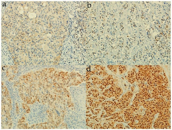 Representative images of tissue samples with different percentages of tumor nuclei with androgen receptor protein expression. (a) 0% of AR+ tumor nuclei (200× magnification); (b) 30% of AR+ tumor nuclei (200×); (c) 60% of AR+ tumor nuclei (200×); (d) 100% of AR+ tumor nuclei (200×).