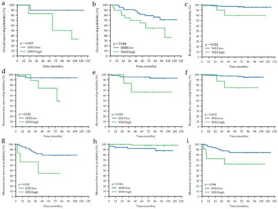 Kaplan-Meier survival curves depicting significant impact of sonic hedgehog (SHH) protein expression on different types of survival in different groups of breast cancer patients. (a) Impact on overall survival (OS) in HER2-enriched (n = 16); (b) OS in ER-negative (n = 64); (c) Impact on recurrence-free survival (RFS) in the whole cohort (N = 185); (d) RFS in TNBC (n = 47); (e) RFS in PR-negative (n = 79); (f) RFS in HER2-negative (n = 142); (g) Impact on metastasis-free survival (MFS) in TNBC (n = 47); (h) MFS in ER-positive (n = 121); (i) MFS in PR-negative (n = 79). Shown are p-values for the long-rank test. Tick marks indicate censored cases.