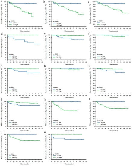 Kaplan-Meier survival curves depicting a significant impact of androgen receptor (AR) protein expression on different types of survival in different groups of breast cancer patients. (a) Impact on overall survival (OS) in TNBC patients (n = 47); (b) OS in ER-negative (n = 64); (c) OS in PR-negative (n = 79); (d) OS in HER2-positive (n = 64); (e) Impact on recurrence-free survival (RFS) in the whole cohort (N = 185); (f) RFS in ER-positive (n = 121); (g) RFS in PR-negative (n = 79); (h) RFS in PR-positive (n = 106); (i) RFS in HER2-negative (n = 142); (j) Impact on metastasis-free survival (MFS) in the whole cohort (N = 185); (k) MFS in TNBC (n = 47); (l) MFS in ER-negative (n = 64); (m) MFS in PR-negative (n = 79); (n) MFS in HER2-positive (n = 43). Shown are p-values for the long-rank test. Tick marks indicate censored cases.