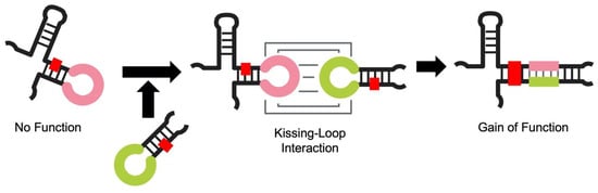 However, the effective evolution of RNA towards the formation of a life system may require the acquisition of “multiple” functions via a kissing-loop interaction. In the present study, we demonstrate that two nonfunctional RNAs can gain “two” separate functions through a kissing-loop interaction-induced rearrangement; we also discuss the versatility of kissing-loop interactions in the evolution of RNA.