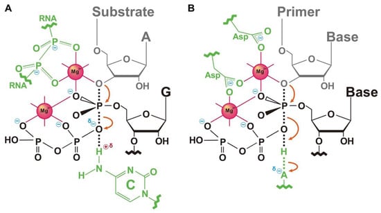 Transition-state-stabilization model constructed from either RNA or protein. Active site of (A) class I ligase ribozyme and (B) RNA polymerase. This figure was modified from Shechner et al. [55].