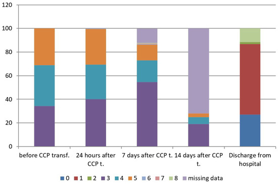 The concomitant therapy is shown in Supplemental Table (Table S1). The mean concentration of anti-SARS-CoV-2 S-RBD IgG (AU/mL) of CCP units transfused to patients was 28.7± 23.9 AU/mL (IQR 11.3–40.8), with a range from 5.1 to 100.0 AU/mL. The mean duration of oxygenation support after CCP transfusion was 7.4 ± 5.2 days (range 1–26): It was 5.4 ± 3.5 in patients with WHO score 4 (range 1–16), and 9.4 ± 5.8 in patients with WHO score 5 (range 1–26). Hospital length of stay after CCP transfusion was 11.0 ± 5.3 days (range 3–29), in patients with WHO score 3 was 8.6 ± 2.7 days (range 3–15), in patients with WHO score 4 was 11.1 ± 4.7 days, (range 4–29) and in patients with WHO score 5 was 13.6 ± 6.7 days, (range 3–29). According to the ANOVA test, the difference between three subgroups was significant for p < 0.05. Afterwards, Turkey HSD test was performed and showed a difference between WHO score 3 versus WHO scores 4 and 5, and WHO score 4 versus WHO score 5 (Table 3). There was only one of 189 treated patients (0.53%), who was admitted to an intensive care unit (ICU) after CCP transfusion, while there were 39 patients already admitted to ICU before CCP transfusion. There were 65 oxygenation-free patients (34.4%) at enrolment belonging to WHO disease progression score 3 on 8-point clinical progression scale, 76 patients (40.2%) were oxygen-free 24 h after CCP transfusion, 103 patients (54.5%) were oxygen-free seven days after CCP transfusion and 167 patients (88.36%) were oxygen-free at discharge. According to the dynamic index, there was an increase rate of 32.3% of oxygenation-free days 24 h after CCP transfusion and an increase rate of 58.5% of oxygenation-free days seven days after CCP transfusion. The type of respiratory support is shown in Table 4. The clinical status of treated patients at different time points is shown in Table 5 and Figure 1, which show evident clinical improvement on the 8-point WHO clinical progression scale.