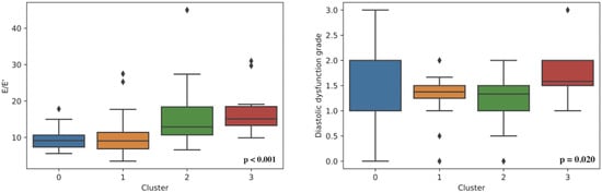 Echocardiography parameters showed that cluster 3 had the smallest diameters and volumes of the left ventricle in both systole and diastole with the highest thickness of the interventricular septum, while cluster 2 had the highest measurements of the left ventricle cavity. Accordingly, left ventricular systolic function expressed through ejection fraction was greatest in cluster 3 and lowest in cluster 2. However, cluster 3 had the most impaired diastolic function and the highest left ventricular filling pressures expressed through E/e’.