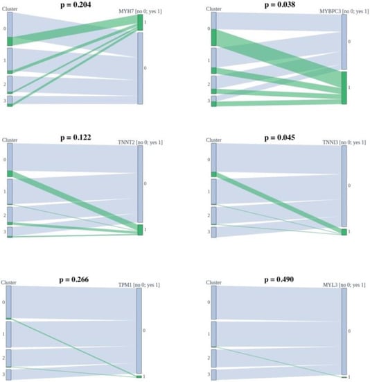 Mutations were found in the six causal genes for HCM (MYH7, MYBPC3, TNNT2, TNNI3, TPM1, and MYL3). The associations of the determined clusters and genes in which mutations are found are shown in Figure 2. Clusters do not statistically differ based on the mutated genes.