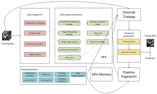 Figure 1, when the image dataset is input to the pipeline, the training data will be cropped to nonzero region and the properties of the dataset (data fingerprint) is analyzed automatically for experiment planning. based on the data fingerprint, the rule-based parameters used for preprocessing and training are generated. The preprocessing related parameters are all generated according to the data fingerprint, and the parameters for networking training are also related to device limitation (i.e., GPU RAM).