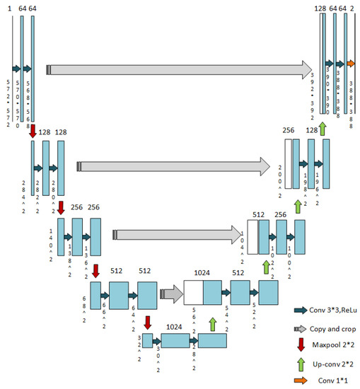 Figure 2, the network architecture of the generic U-net is a typical encoder-decoder CNN architecture. The encoder of the U-net, is also named as contraction path which performs convolution and down-sampling operations, while the decoder, also known as expanding path, up-samples the compressed representation at the bottleneck of the encoder to the input resolution and outputs the prediction. The corresponding layers of the path are connected by a skip-connection operation, which copies and concatenates the output of contracted path to the feature map of the expanding path in order to retain the low-resolution information that could potentially be lost when down-sampling the input image. Each layer of both contraction path and expanding path consist of 2 convolution layers of 3 × 3 with a Rectified Linear Unit (ReLU) activation function, the difference between the paths is that after convolution operations, the contraction path performs a down-sampling operation using a max pooling layer of 2 × 2, which cut the output to half while the expanding path used an up-convolution layer of 2 × 2, which doubles the output after convolution layers. In the last layer of expanding path, a 1 × 1 convolution layer is used to reduce the channels while keeping the size of the output. After the layer, the segmentation output is finally generated.