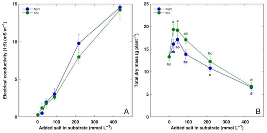 Substrate electrical conductivity (EC1:5) after cultivation of Plantago maritima plants treated with different doses of NaCl and KCl (A) and effect of treatments on total dry biomass of P. maritima plants (B). Different letters indicate statistically significant (p < 0.05) differences between treatments.