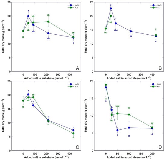 Effect of treatment with different doses of NaCl and KCl on total dry biomass of Beta vulgaris subsp. vulgaris var. cicla (A), Beta vulgaris subsp. maritima (B), Cochlearia offficinalis (C) and Mentha aquatica (D) plants. Different letters indicate statistically significant (p < 0.05) differences between treatments.