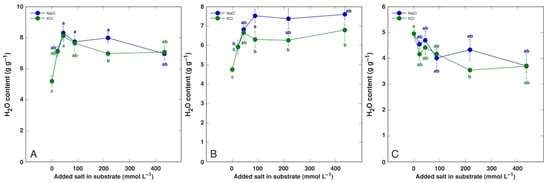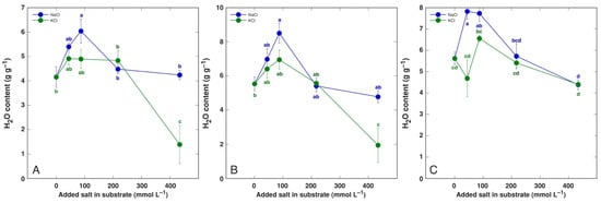 Tissue water content in old leaves (A), young leaves (B) and roots (C) of Plantago maritima plants treated with different doses of NaCl and KCl. Different letters indicate statistically significant (p < 0.05) differences between treatments.