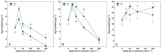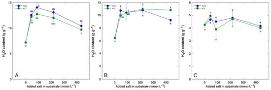 Tissue water content in leaves (A), stems (B) and roots (C) of Mentha aquatica plants treated with different doses of NaCl and KCl. Different letters indicate statistically significant (p < 0.05) differences between treatments.