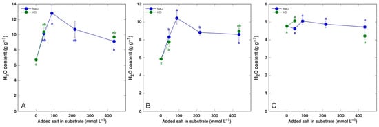 Tissue water content in old leaves (A), young leaves (B) and roots (C) of Beta vulgaris subsp. vulgaris var. cicla plants treated with different doses of NaCl and KCl. Different letters indicate statistically significant (p < 0.05) differences between treatments.