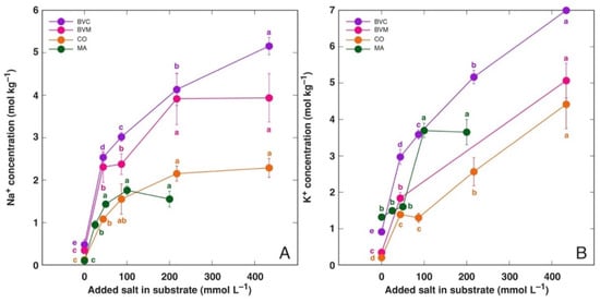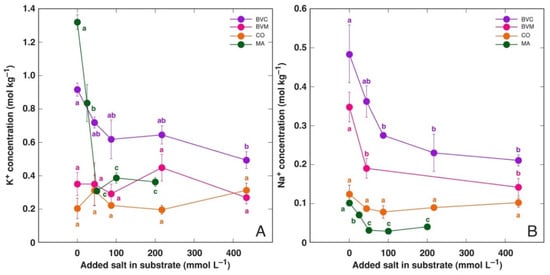 Effect of treatment with different doses of NaCl on K+ concentration in leaves (A) and effect of treatment with different doses of KCl on Na+ concentration in leaves (B) of Beta vulgaris subsp. vulgaris var. cicla (BVC), Beta vulgaris subsp. maritima (BVM), Cochlearia officinalis (CO) and Mentha aquatica (MA) plants. Different letters of respective colors indicate statistically significant (p < 0.05) differences between treatments for a respective plant taxon.