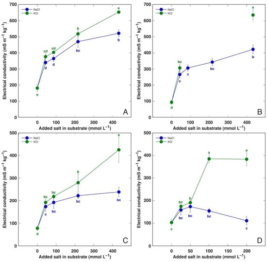 Effect of treatment with different doses of NaCl and KCl on electrical conductivity in leaf extracts of Beta vulgaris subsp. vulgaris var. cicla (old leaf blades; (A)), Beta vulgaris subsp. maritima (old leaf blades; (B)), Cochlearia officinalis (leaf blades; (C)) and Mentha aquatica (leaves; (D)) plants. Different letters indicate statistically significant (p < 0.05) differences between treatments.