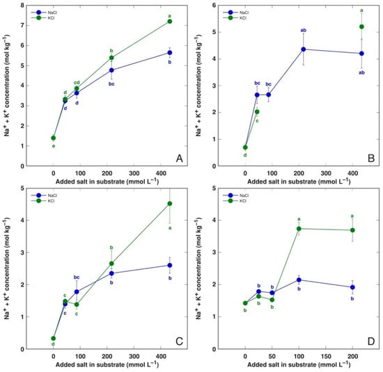 Effect of treatment with different doses of NaCl and KCl on Na+ + K+ concentration in leaf extracts of Beta vulgaris subsp. vulgaris var. cicla (A), Beta vulgaris subsp. maritima (B), Cochlearia officinalis (C) and Mentha aquatica (D) plants. Different letters indicate statistically significant (p < 0.05) differences between treatments.