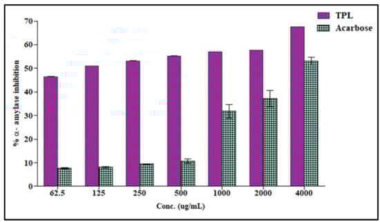 α-Amylase inhibitory activity of various concentrations (μg/mL) of T. polium hydroalcoholic extract (TPL) vs. acarbose; Values were expressed as means ± SD (n = 3) for three parallel measurements.