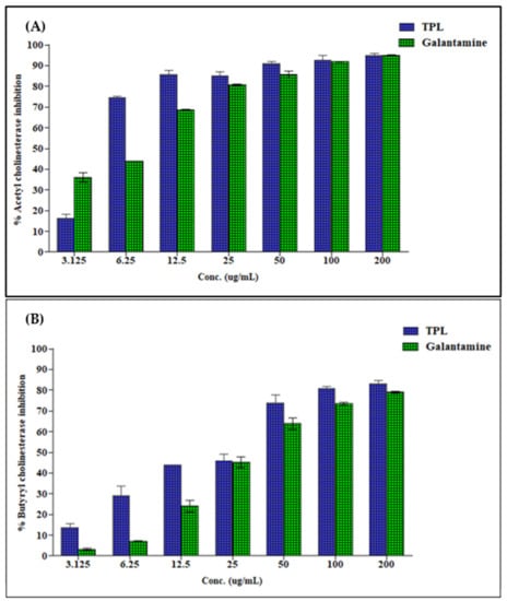 Acetylcholinesterase (A) and butyrylcholinesterase (B) inhibitory activity of various concentrations (μg/mL) of T. polium hydroalcoholic extract (TPL) vs. Galantamine: Values were expressed as means ± SD (n = 3) for three parallel measurements.