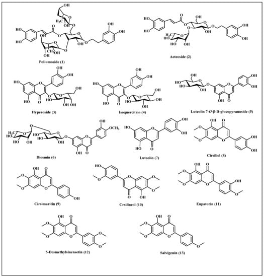 The extract of T. polium L. aerial parts is highly rich in phenolic compounds. Previous HPLC-UV-MS analysis conducted on the extract of Algerian Teucrium polium aerial parts revealed the existence of many phenolic compounds belonging mainly to flavonoids and caffeic acid derivatives. These include poliumoside (1), acteoside (2), hyperoside (3), isoquercitrin (4), luteolin 7-O-β-D-glucopyranoside (5), diosmin (6), luteolin (7), cirsiliol (8), cirsimaritin (9), cirsilineol (10), eupatorin (11), 5-desmethylsinensetin (12) and salvigenin (13) [14]. A scheme showing compounds previously identified from Algerian Teucrium polium aerial parts is illustrated in Figure 3.
