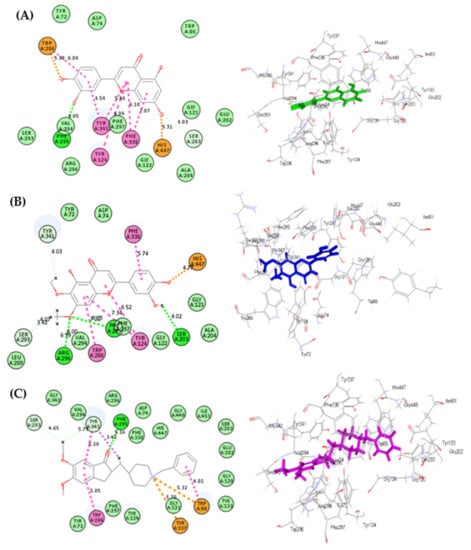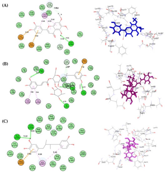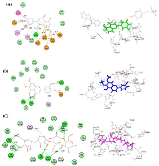 Validation experiments revealed an acceptable alignment between the docking pose of the lead compounds that showed the best fitting with the co-crystallized lead conformers. They displayed RMSD values of 1.18, 1.74, and 2.50 Å for human α-amylase, 5-lipoxygenase and acetylcholine esterase, respectively (Figure S1).
