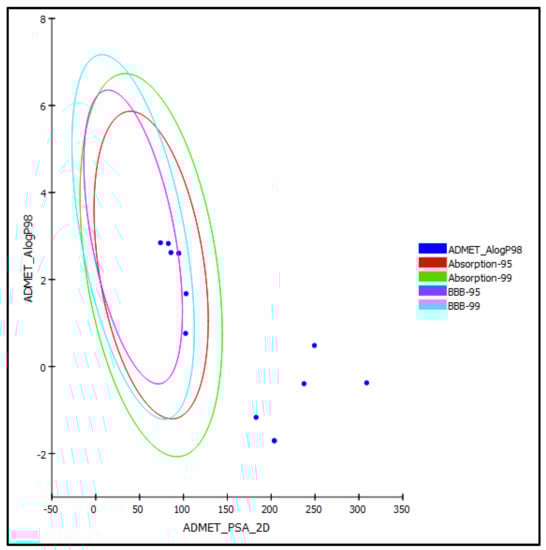 ADMET (absorption, distribution, metabolism, excretion and toxicity) determination for the prediction of the pharmacokinetic, pharmacodynamic and toxicity properties and drug likeness was performed on previously identified compounds by HPLC-UV-MS analysis, conducted on Algerian T. polium aerial parts extract using Biovia Discovery Studio software (Accelrys Inc., San Diego, CA, USA). Plasma protein binding prediction (PPB), human intestinal absorption, aqueous solubility, blood–brain barrier penetration (BBB), and cytochrome P450 (2D6) and hepatotoxicity level were chosen as ADMET parameters. However, ALogP, molecular weight (M.W.), number of hydrogen bond acceptors (HBA), number of hydrogen bonds donor (HBD), number of rings, number of aromatic rings and number of rotatable bonds were selected as drug likeness descriptors [34].