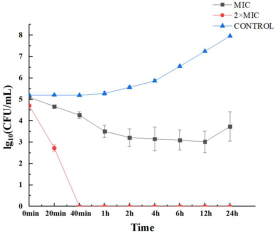 Time–killing kinetics is an important parameter to judge the performance of antimicrobial peptides. The results were as shown in the Figure 1. After treatment with concentration of 2 × MIC, the number of viable bacteria was dramatically decreased, and Candida albicans could be completely killed within 40 min. The killing kinetics curve of Cecropin treated with MIC concentration firstly decreased and then increased, and the results showed that Cecropin with MIC concentration could not completely kill Candida albicans, even after incubation for 24 h.