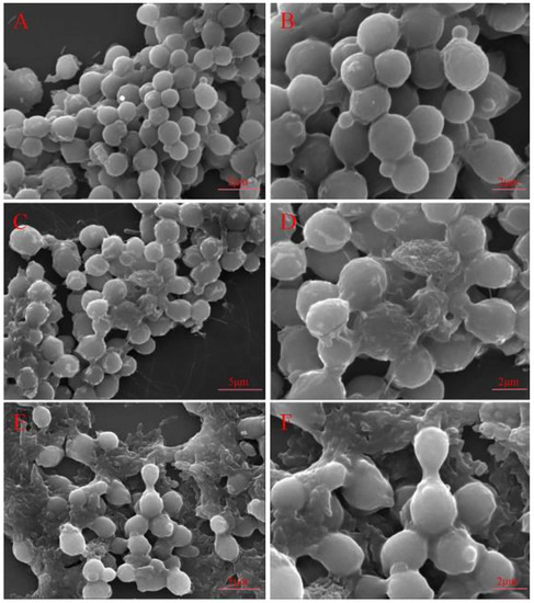 Scanning electron micrographs of Candida albicans either untreated or treated with Cecropin: (A,B) untreated control, (C,D) treatment with 1.8 μg/mL Cecropin for 30 min, and (E,F) treatment with 1.8 μg/mL Cecropin for 60 min.