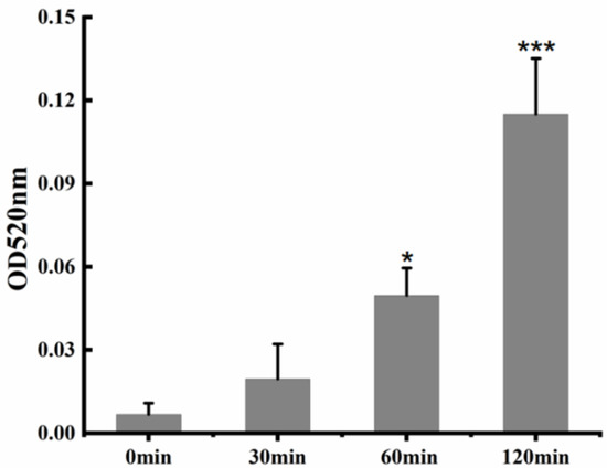 AKP is a phosphatase that is present between the cell wall and the cell membrane, and it can be used as an indicator of cell-wall permeability. As shown in Figure 4, with the increase of incubation time of Cecropin and Candida albicans, the activity of extracellular AKP enzyme also gradually increased. The one-way analysis of variance showed that after incubation of Cecropin with Candida albicans for 60 min and 120 min, compared with the control group, the significant increase of extracellular AKP activity was 7.3-fold and 16.9-fold, respectively. The above data indicated that the cell wall was damaged or even destroyed by the polypeptide treatment of Rhizoma Gastrodiae, resulting in the leakage of the AKP enzyme, which was consistent with the observation results under the electron microscope.