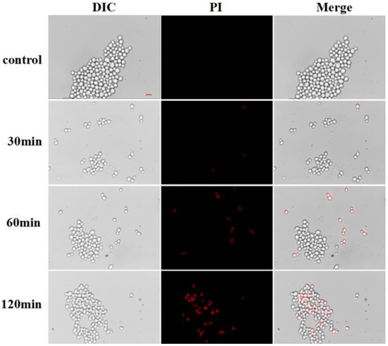 Propidium iodide (PI) was a fluorescent dye. It could not enter the cells with intact cell membrane, but it could enter the cells with damaged membrane structure and emit red fluorescence. Based on this characteristic, a fluorescence microscope observation was conducted. When the permeability of the cell membrane is increased, more PI dye will enter the cell, thus reflecting the integrity of the cell membrane. The observation showed that no PI fluorescence was observed in the Candida albicans control group without peptide treatment, indicating that the cell membrane of Candida albicans was intact. In the presence of 1.8 μg/mL of Cecropin, the absorption of PI by Candida albicans gradually increased with the increase of incubation time. When the time increased to 120 min, the red fluorescent cells of Candida albicans were the most (Figure 5). These results indicated that the cell membrane of Candida albicans was damaged and that permeability was increased after the treatment with Cecropin.