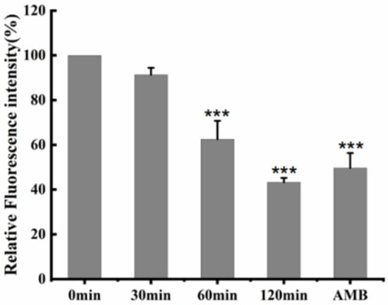 To further investigate the active mechanism of Cecropin, we used the fluorescent probes 1,6-diphenyl-1,3,5-hexatriene (DPH) to obtain information about its membrane fluidity. DPH is a hydrophobic molecule that allows it to bind to the hydrocarbon tail region of phospholipids in the cytoplasmic membrane without interfering with the structure of the lipid bilayer. Such fluorescent probes are commonly used not only to study the structure of membranes, but also to study the biophysical properties of membranes. In addition, the fluidity of the film can also be measured by fluorescence spectral analysis, using DPH molecules. If the anti-Candida albicans activity of the antimicrobial peptide causes membrane damage by membrane depolarization, the DPH molecule cannot bind to the lipophilic tail of the phospholipid in the lipid bilayer. As shown in Figure 6, with the increase of incubation time between the peptide and Candida albicans, the fluorescence intensity of DPH gradually decreased, and the one-way analysis of variance found that, compared with the control, the incubation time of 60 min and 120 min had significant differences, which decreased by 37.45% and 56.65%, respectively. The positive control, amphotericin B, decreased by 50.28%, indicating that Cecropin could significantly change the cell-membrane fluidity of Candida albicans after 60 min of treatment.