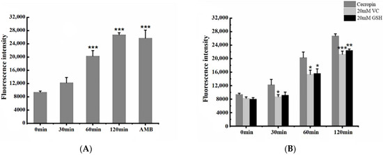 The formation of reactive oxygen species (ROS) is considered to be one of the bactericidal mechanisms of many antibacterial peptides. Dye DCFH-DA can freely pass through the cell membrane and enter the cells to be oxidized into DCFH, which cannot pass through the cell membrane, thus allowing the probe to be easily loaded into the cells. Cellular reactive oxygen species can oxidize non-fluorescent DCFH to generate DCF, producing green fluorescence, and the level of intracellular reactive oxygen species can be known by detecting the fluorescence of DCF. After Candida albicans was incubated with Cecropin at a concentration of 2 × MIC for different times, ROSs produced by Cecropin were detected, as shown in Figure 7A. Compared with the untreated control, the ROS levels gradually increased with the passage of time. Through the one-way analysis of variance, it was found that the treatment of Candida albicans with Cecropin for 60 min and 120 min had a significant difference compared with the control (0 min) ratio and increased by 2.16 and 2.85 times, respectively. The positive control, amphotericin B, also increased 2.74 times, indicating that Cecropin can induce the production of reactive oxygen species in Candida albicans. In the presence of the antioxidant VC, the ROS levels were significantly decreased at 30 min, 60 min, and 120 min compared with the control group, while in the presence of GSH antioxidants, the ROS levels were significantly decreased at 60 min and 120 min, indicating that the addition of VC and GSH could inhibit the production of ROSs induced by Cecropin (Figure 7B).