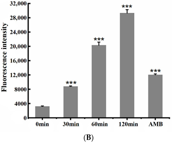 Mitochondrial membrane potential, as an indicator of the cell’s energy state, can reflect the proton loading in mitochondria, the activity of electron transporters, and the permeability of mitochondrial membrane. We used rhodamine as a probe to detect the effect of Cecropin on the mitochondrial-membrane potential of Candida albicans strains. The results of the multifunctional microplate reader showed that the fluorescence intensities of Cecropin treated for 30 min, 60 min, and 120 min were 2.75-times, 6.35-times, and 9.16-times higher than those of the untreated ones, respectively, while the fluorescence intensity of the positive control, amphotericin B, increased only 3.76 times after 2 h treatment. The results of the inverted fluorescence microscope were consistent with those of Figure 8B, where the fluorescence intensity was significantly enhanced at a concentration of 1.8 μg/mL of the peptide Cecropin (Figure 8A). These results indicated that Cecropin could induce the hyperpolarization of the mitochondrial membrane potential and induce mitochondrial damage.
