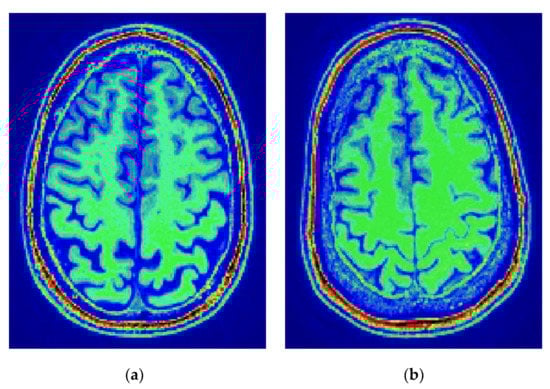 Axial views of the brain and their membranous envelopes obtained from two subjects in this study. The Brain2ICV or brain-volume-to-intracranial-volume ratio was Brain2ICV = TBV/eTIV = 929,035/1,460,465 = 0.7196 for the left figure, and Brain2ICV = TBV/eTIV = 929,035/132,7593 = 0.6997 for the right figure. (a) Male subject, 74 years old, Brain2ICV = 71.96%; (b) Female subject, 76 years old, Brain2ICV = 69.97%.