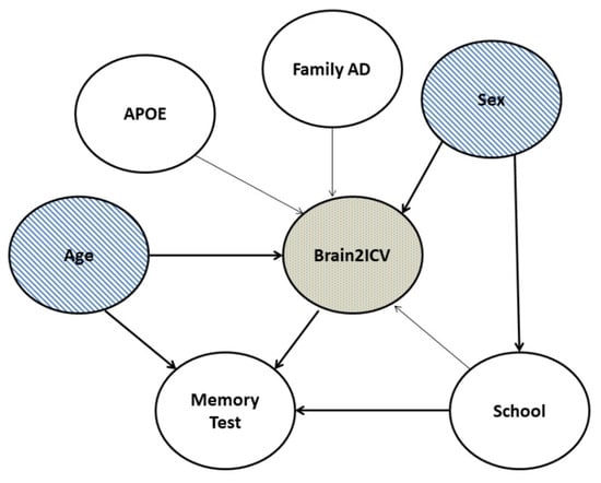 Although the association between age and brain atrophy is indisputable, the question of how sex mediates brain atrophy is unclear, with studies suggesting that the ratio of the total brain volume to intracranial brain volume is higher either in men [] or in women []. The question we aimed to answer can be expressed as follows: Is there a direct causal relationship between sex and Brain2ICV?