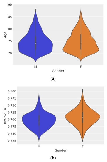 Figure 3 shows violin plots of age grouped by sex (Figure 3a) and Brain2ICV grouped by sex (Figure 3b). Hypothesis testing of the ages of men and women showed no difference between the two groups, with p = 0.572 (Figure 3a). However, the test for the means of the Brain2ICV values for men and women (Figure 3b) yielded p = 2.583−8, which is less than the threshold of 1%, thus disproving the null hypothesis. According to Figure 3b, women, on average, entered old age (70 or older) with slightly less brain atrophy than men, as explained by the brain-to-intracranial-volume ratio variable (Brain2ICV).