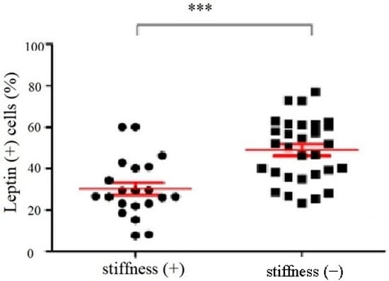 The percentage of leptin positive cells in the subacromial bursa obtained from the patients with and without SS under immunoblotting (***: p < 0.001).