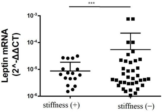 The mRNA expression levels of leptin in the subacromial bursa obtained from the patients with and without SS (***: p < 0.001).