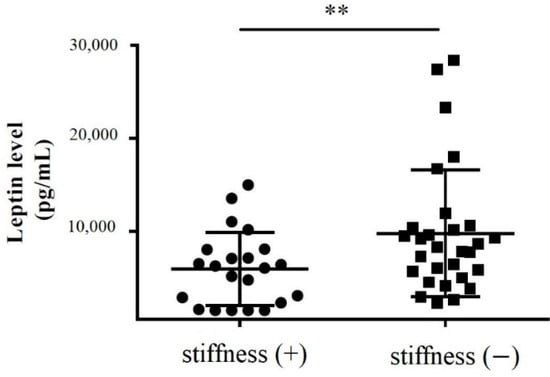 Subacromial fluid was also obtained during rotator cuff repair surgery for enzyme-linked immunosorbent assay (ELISA). We showed that the leptin protein levels in the subacromial fluid obtained from stiff shoulders were markedly lower than those from the nonstiff shoulders (p = 0.011) (Figure 3).