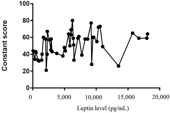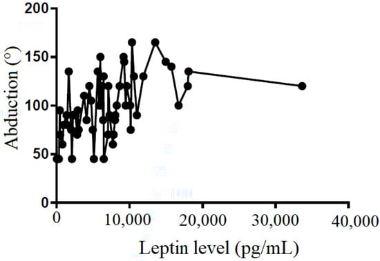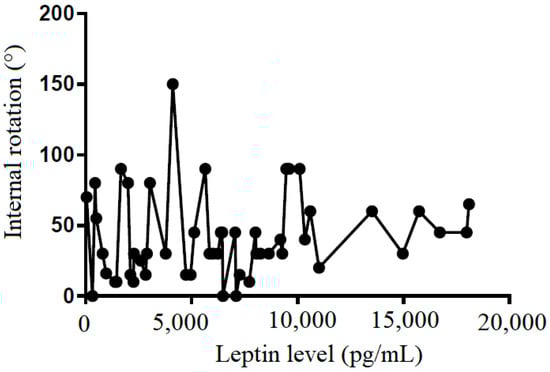 We also tried to demonstrate the correlation between the leptin level in the subacromial fluid and the clinical parameters (constant score, total range of motion, flexion, abduction, external rotation, and internal rotation) (Table 2). We showed that leptin level in the subacromial fluid was positively associated with the Constant score (Figure 4), total range of motion (Figure 5), flexion (Figure 6), abduction (Figure 7), and external rotation (Figure 8). However, no correlation between leptin level and internal ration could be observed (Figure 9).